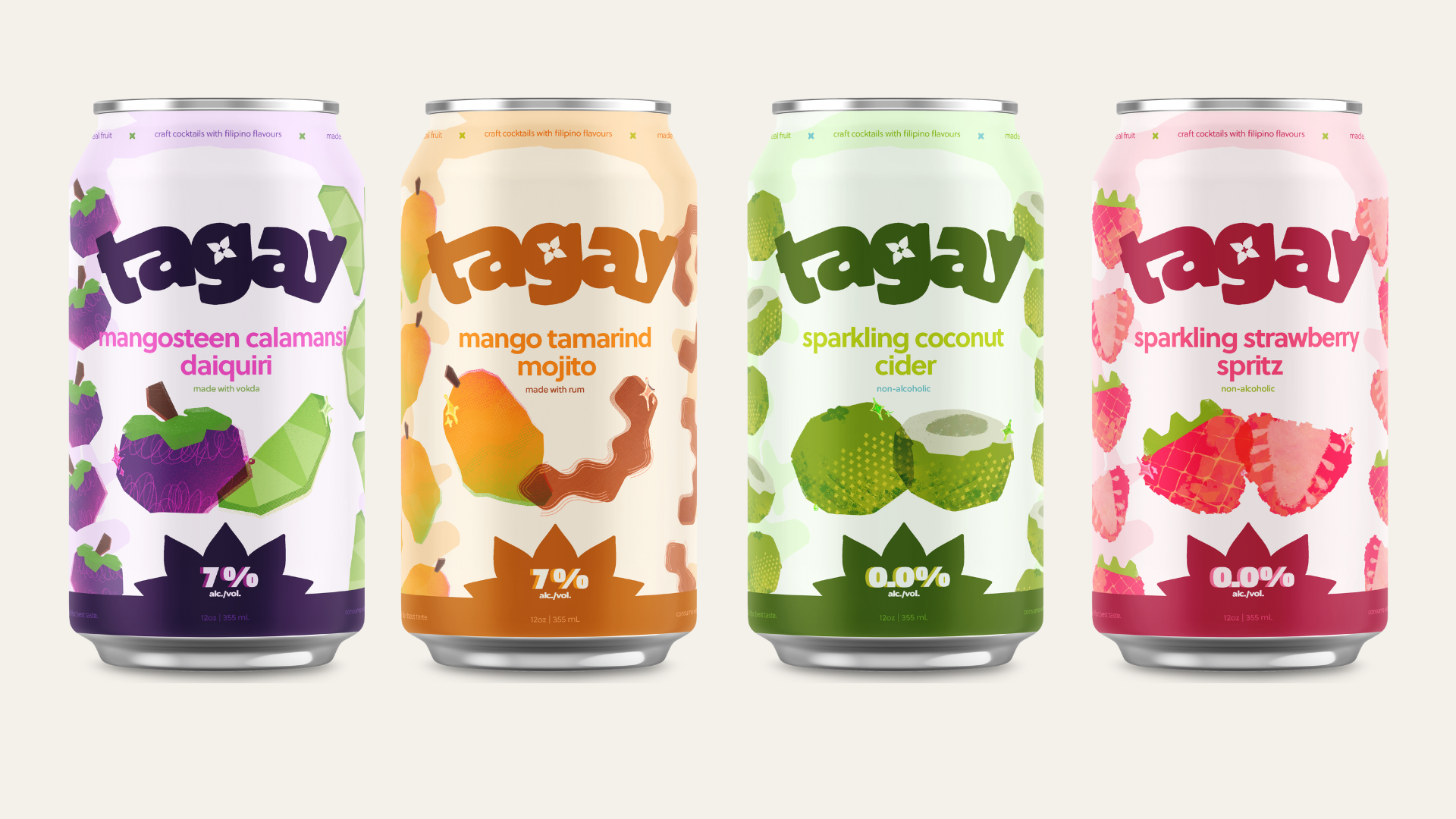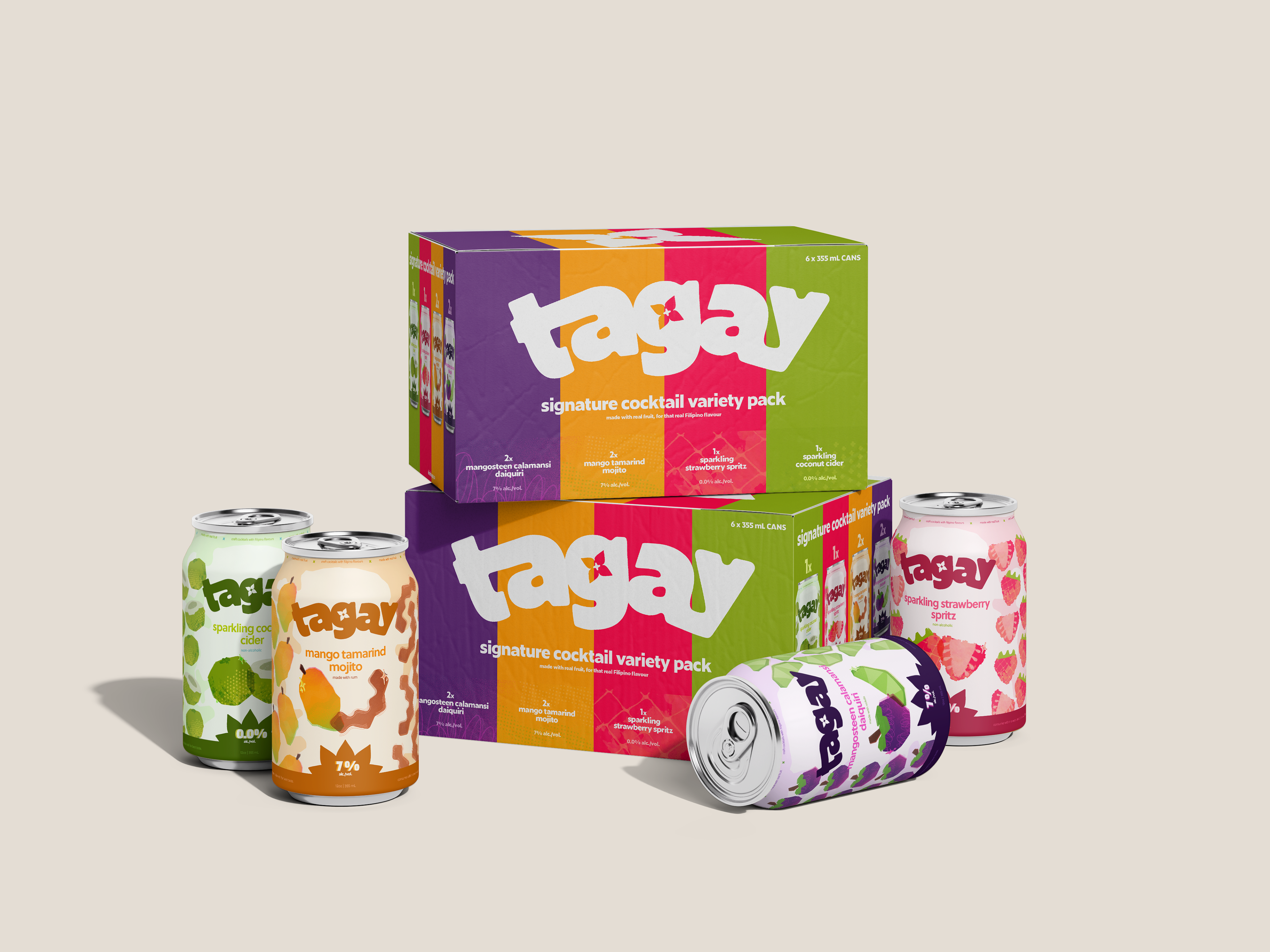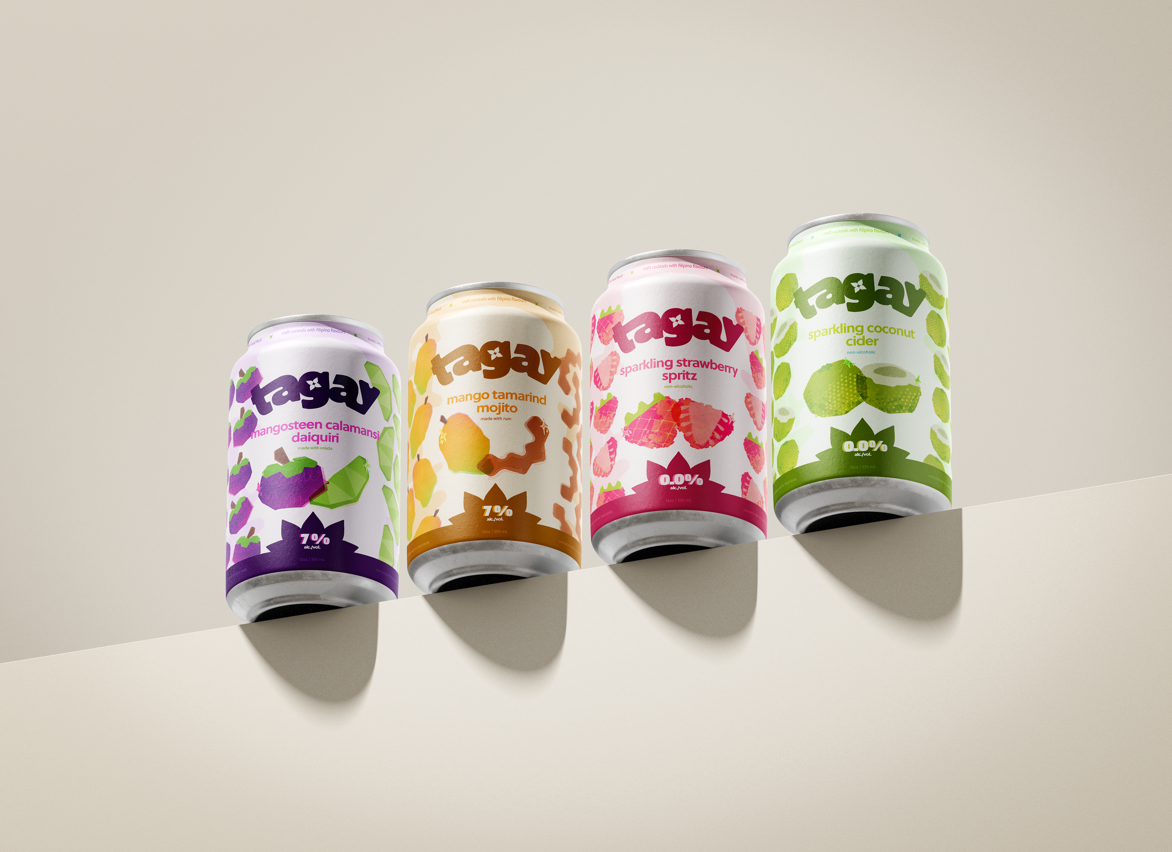 Tagay (meaning "cheers" in Tagalog) is a conceptual canned craft cocktail brand with Filipino-inspired flavours and packaging. the bright colours and different textures pay homage to the culture. packaging is also inspired by the Filipino holiday Pahiyas, which celebrates a bountiful harvest.
